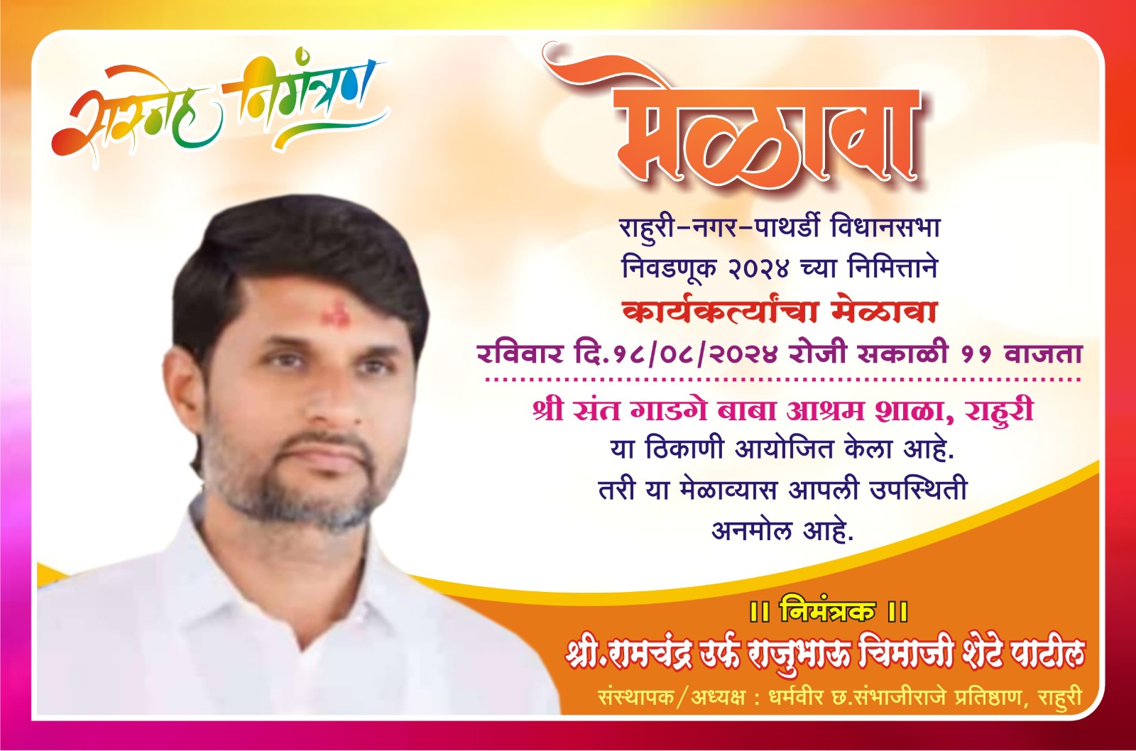 आहे.तरी,राहुरी,नगर,पाथर्डी विधानसभा मतदारसंघातील कार्यकर्त्यांनी मोठ्या संख्येने उपस्थित राहावे असे धर्मवीर छत्रपती संभाजी राजे प्रतिष्ठानच्या वतीने करण्यात येत आहे.