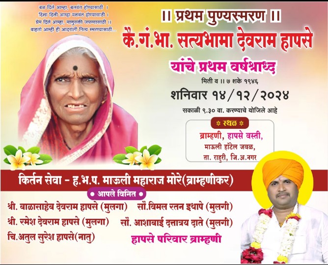 ब्राम्हणी गावातील जेष्ठ महिला व्यक्तिमत्व व हापसे परिवारातील प्रमुख कै.गं.भा.सत्यभामा देवराम हापसे यांचे उद्या शनिवार दि.१४ डिसेंबर २०२४ रोजी प्रथम पुण्यस्मरण त्यानिमित्त मातोश्रीच्या स्मृतीस विनम्र आदरांजली…