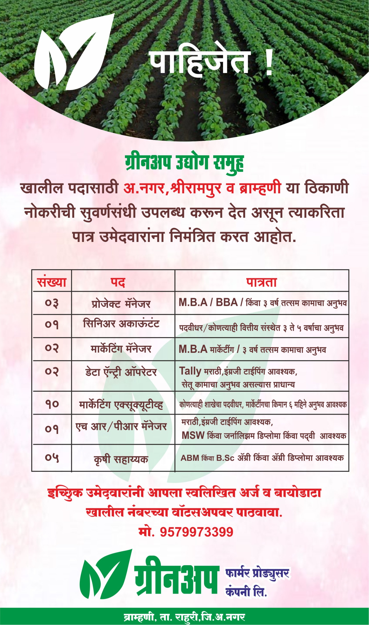 गणेश हापसे: गणराज्य न्यूज टीम ब्राम्हणी : अल्पावधीतच जिल्ह्यात, राज्यभर व देशातील निवडक यशस्वी शेतकरी उत्पादक कंपन्यांपैकी एक असलेल्या ग्रीनअप फार्मर प्रोड्युसर कंपनीच्या अहिल्यानगर, श्रीरामपूर आणि ब्राम्हणी या तिन्ही कार्यालयात इच्छुकांना जॉबची संधी उपलब्ध झाली असून विविध पदासाठी सुमारे 37 जणांना नोकऱ्या उपलब्ध होणार आहेत.