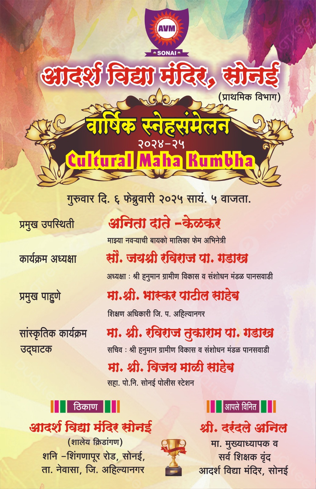 माझ्या नवऱ्याची बायको मालिकामधील प्रसिद्ध अभिनेत्री अनिता दाते-केळकर यांच्या प्रमुख उपस्थितीत व श्री हनुमान ग्रामीण विकास व संशोधन मंडळाच्या अध्यक्षा सौ.जयश्री रविराज गडाख यांच्या अध्यक्षतेखाली होत आहे.यावेळी जिल्हा परिषद प्राथमिक शिक्षण विभागाचे शिक्षणाधिकारी भास्कर पाटील उपस्थित राहणार आहेत. दरम्यान सांस्कृतिक कार्यक्रमाचे उद्घाटन श्री हनुमान ग्रामीण विकास व संशोधन मंडळाचे सचिव रविराज तुकाराम गडाख,सोनई पोलीस ठाण्याचे सहाय्यक पोलीस निरीक्षक विजय माळी यांच्याहस्ते होणार आहे.तरी आपण सर्वांनी चिमुकल्यांचा कलाविष्कार पाहण्यासाठी मोठ्या संख्येने उपस्थित राहावे असे आवाहन आदर्श विद्या मंदिर यांच्यावतीने करण्यात येत आहे.