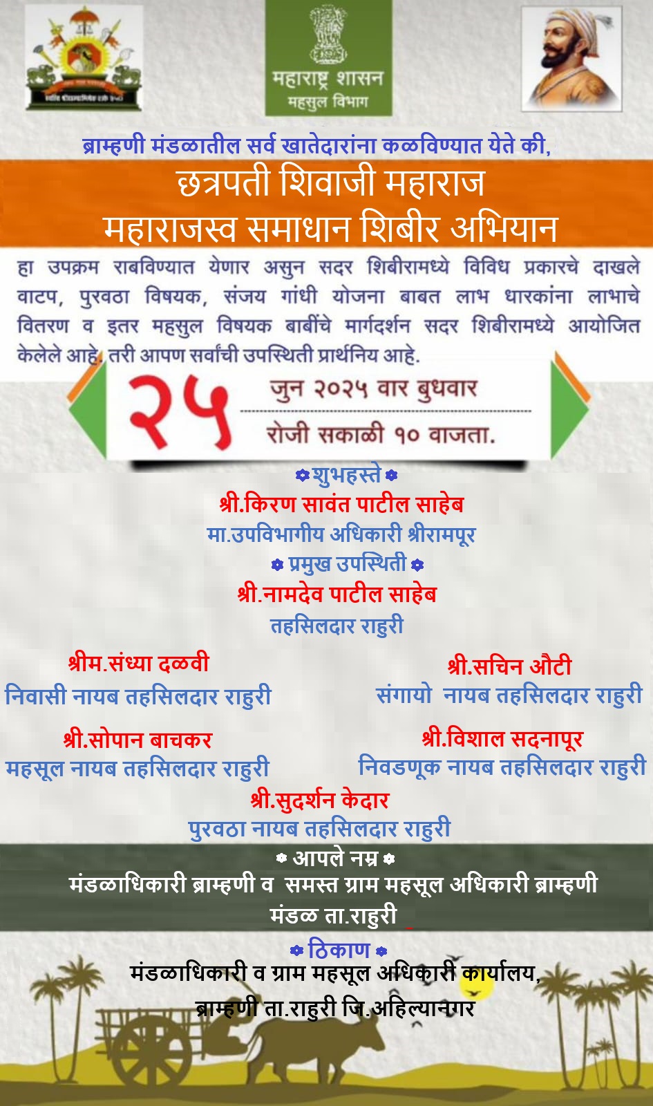 छत्रपती शिवाजी महाराज महाराजस्व अभियान शिबिरात महत्वपूर्ण मार्गदर्शन करण्यात येणार आहे.तरी सर्वांनी मोठ्या संख्येने उपस्थित राहावे असे आवाहन ब्राम्हणीचे मंडळाधिकारी विश्वास आढस यांनी केले आहे…