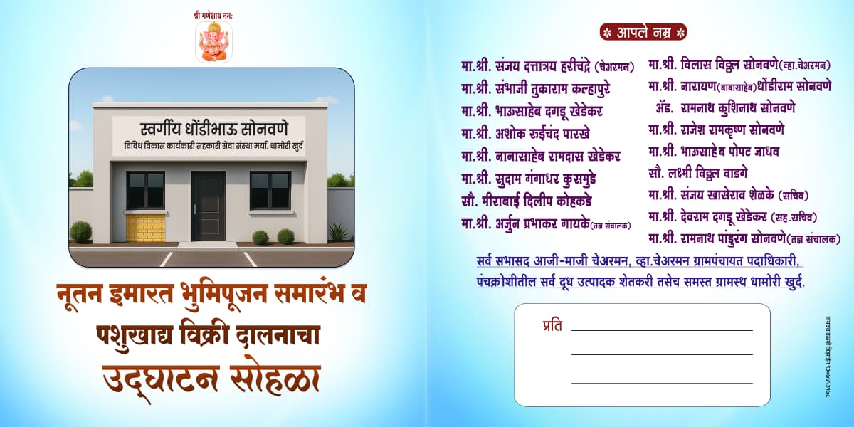 इमारत भूमिपूजन व पशुखाद्य दालन व ई सेवा प्रणाली शुभारंभ सोहळ्यासाठी सर्वांनी मोठ्या संख्येने उपस्थित राहावे असे आवाहन चेअरमन संजय दत्तात्रय हरिश्चंद्रे, व्हाईस चेअरमन विलास विठ्ठल सोनवणे, संचालक संभाजी तुकाराम तुकाराम कल्हापुरे, नारायण उर्फ बाबासाहेब धोंडीराम सोनवणे, भाऊसाहेब दगडू खेडेकर, अँडव्हकेट रामनाथ कुशिनाथ सोनवणे, अशोक रुईचंद पारखे, राजेश रामकृष्ण सोनवणे, नानासाहेब रामदास खेडेकर, भाऊसाहेब पोपट जाधव, सुदाम गंगाधर कुसमुडे, सौभाग्यवती लक्ष्मी विठ्ठल वाडगे, सौभाग्यवती मीराबाई दिलीप कोहकडे,तज्ञ संचालक अर्जुन प्रभाकर गायके, रामनाथ पांडुरंग सोनवणे,सचिव संजय खासेराव शेळके, सहसचिव देवराम दगडू खेडेकर आदींसह आजी-माजी चेअरमन सर्व सभासद, ग्रामपंचायत पदाधिकारी दूध उत्पादक शेतकऱ्यांनी केले आहे.