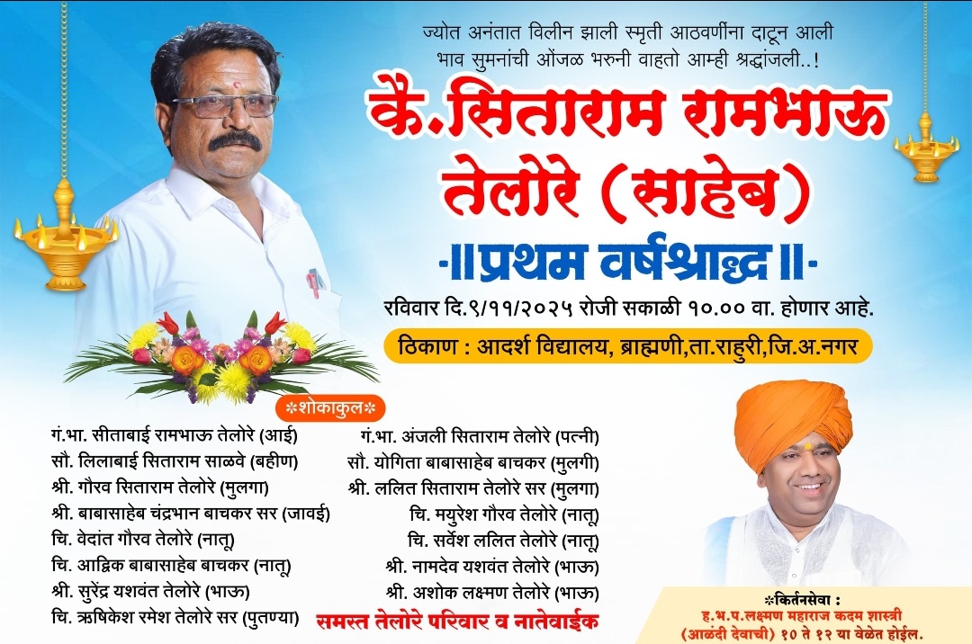गणराज्य न्यूज ब्राम्हणी : अहिल्यानगर जिल्हा सहकारी बँकेच्या विविध शाखेत 33 वर्ष प्रामाणिकपणे कर्तव्य बजावणारे स्व.सिताराम रामभाऊ तेलोरे (साहेब) यांचे रविवार दि.९ नोव्हेंबर रोजी प्रथम पुण्यस्मरण त्यानिमित भावपूर्ण श्रद्धांजली! प्रथम पुण्यस्मरण कार्यक्रमानिमित्त आदर्श विद्यालयाच्या मैदानावर सकाळी 10 वाजता हभप लक्ष्मण महाराज शास्त्री यांचे जाहीर हरी किर्तन होणार आहे.