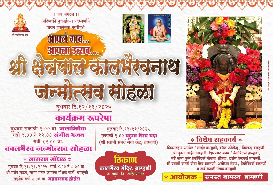 राहुरी : तालुक्यातील क्षेत्र ब्राम्हणी गावात श्री क्षेत्रपाल कालभैरव जन्मोत्सव सोहळ्याचे आज बुधवार 12 नोव्हेंबर रोजी आयोजन करण्यात आहे.तरी भाविक भक्तांनी मोठ्या संख्येने उपस्थित राहावे असे आवाहन करण्यात येत आहे.