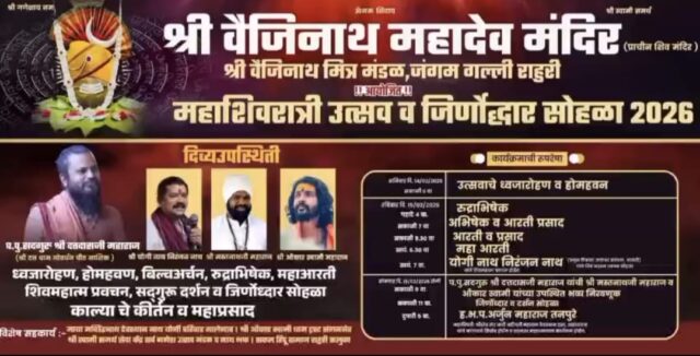 दि. १ फेब्रुवारी २०२६ रोजी वैजिनाथ मित्र मंडळाच्या कार्यकर्त्यांची बैठक संपन्न झाली. या बैठकीत महाशिवरात्री उत्सव समितीच्या अध्यक्ष पदी अथर्व कोरडे, उपाध्यक्ष पदी सिद्धार्थ चौहान, कार्याध्यक्ष रोहित बोरुडे व सिद्धार्थ दुधाडे, खजिनदार तेजस लुक्कड तर सचिव पदी सूरज घाडगे व रोनक सूराणा यांची निवड करण्यात आली.