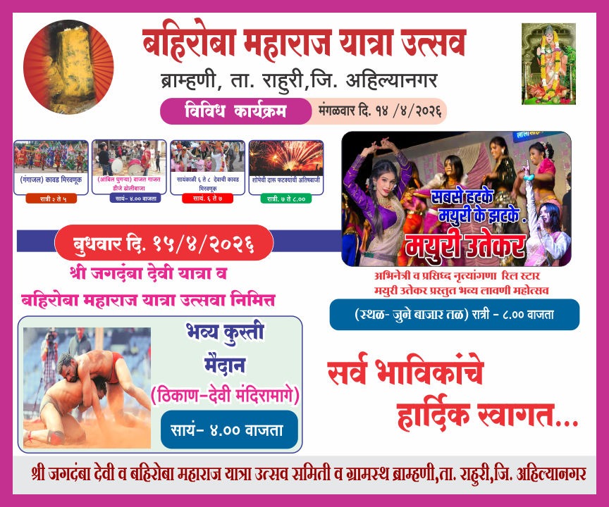 ब्राह्मणी – परिसराच श्रद्धास्थान बहिरोबा महाराज यात्रा उत्सव निमित्त मंगळवार १४ एप्रिल व बुधवार १५ एप्रिल रोजी विविध कार्यक्रमाचे आयोजन करण्यात आले आहे.